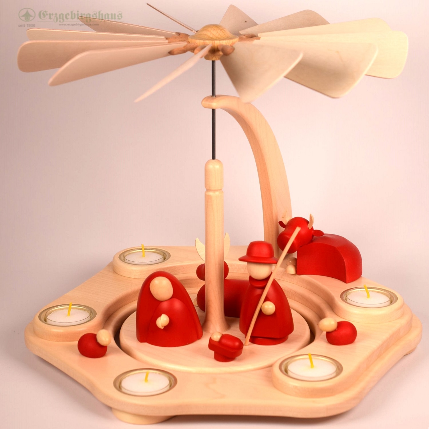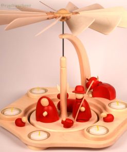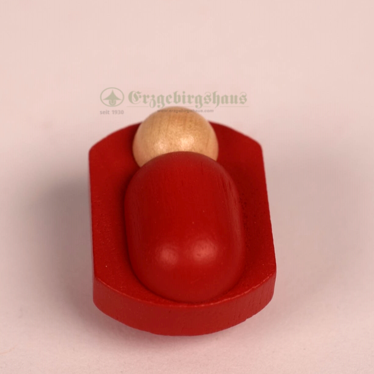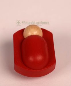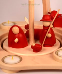- gedrechselte Figuren, rot lasiert, Köpfe und Hände farblos lackiert