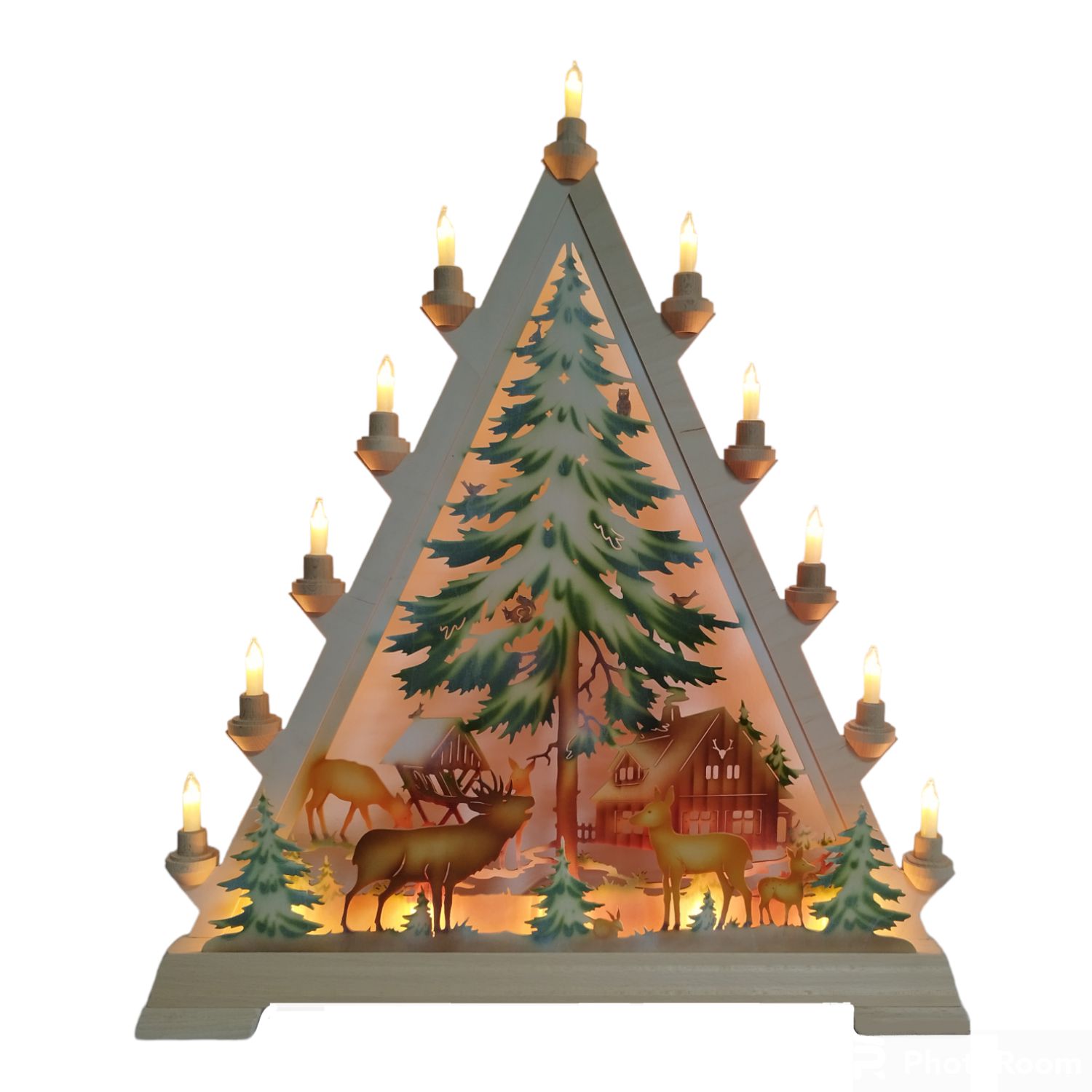 Elf elektrische Kerzen erhellen die Lichterspitze, verteilt über die gesamte Spitze, tauchen sie in ein warmes Glühen. Versteckt hinter dem Vorbau im Vordergrund, auf dem ein imposanter Hirsch sowie eine reizende Rehfamilie zu sehen sind, befinden sich zusätzliche vier elektrische Kerzen. Diese tragen zur indirekten Beleuchtung bei und schaffen eine besonders schöne Stimmung in der Szene.