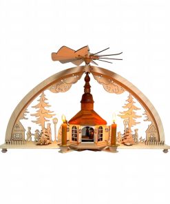 Dieser Mini-Schwibbogen Seiffener Kirche mit roten Kerzen kommt aus dem Hause Rauta.