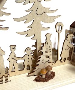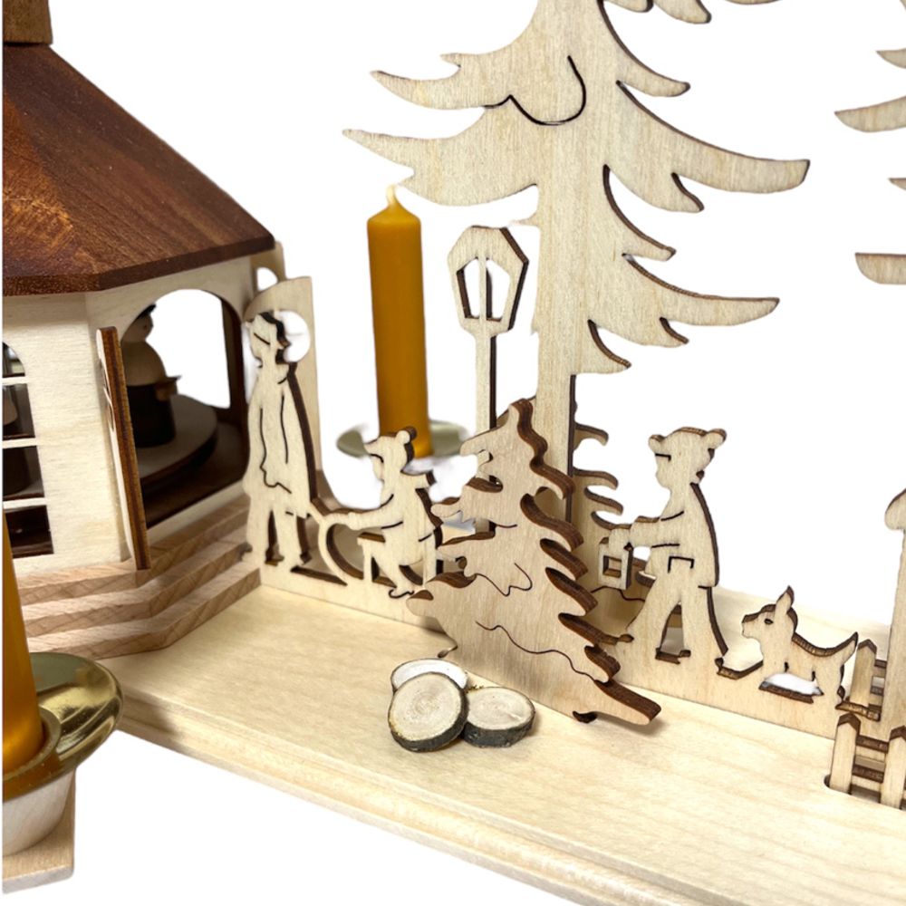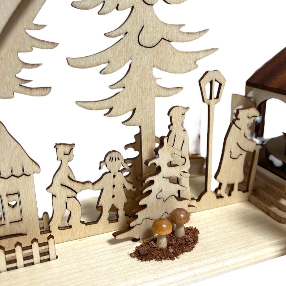 Dieser einzigartige Bogen, ganz in Natur gehalten, präsentiert die Seiffener Kirche als zentrales Motiv. Die Kirche fungiert gleichzeitig als Pyramide, angetrieben durch Pyramidenkerzen mit einem Durchmesser von 14 mm. Im Inneren der Kirche drehen sich die Kurrendensänger, während der Bogen selbst die Szene lebendig gestaltet, indem er zeigt, wie viele Menschen zur Kirche strömen.