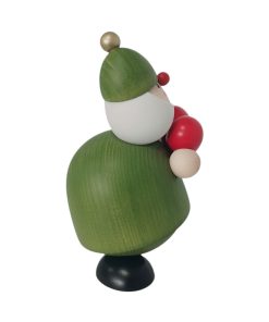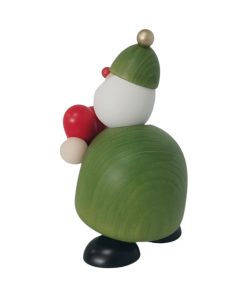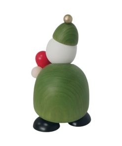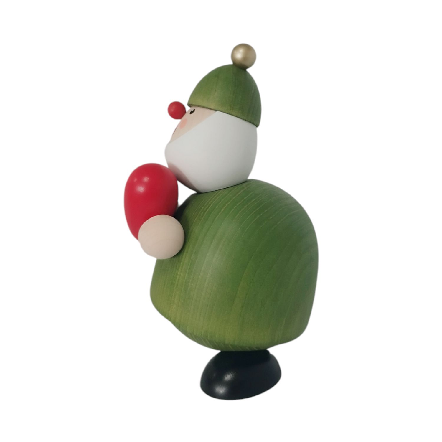 Die Räucherfigur Picus mit Herz ist ein weiteres charmantes Kunstwerk, das durch seine detaillierte Gestaltung und warme Ausstrahlung besticht. Die Figur steht fest auf zwei schwarzen, runden Füßen, die ihr einen soliden Stand geben. Der Körper ist rundlich und in einem hellen Grün gebeizt, wodurch die natürliche Holzmaserung schön zur Geltung kommt und dem Picus eine lebendige Textur verleiht.